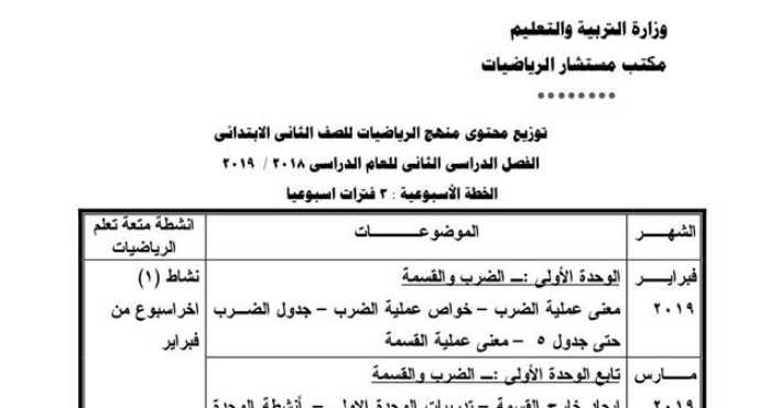 توزيع مناهج الرياضيات للصف الثاني والثالث والرابع والخامس والسادس الابتدائي للعام الدراسي 2018 2019